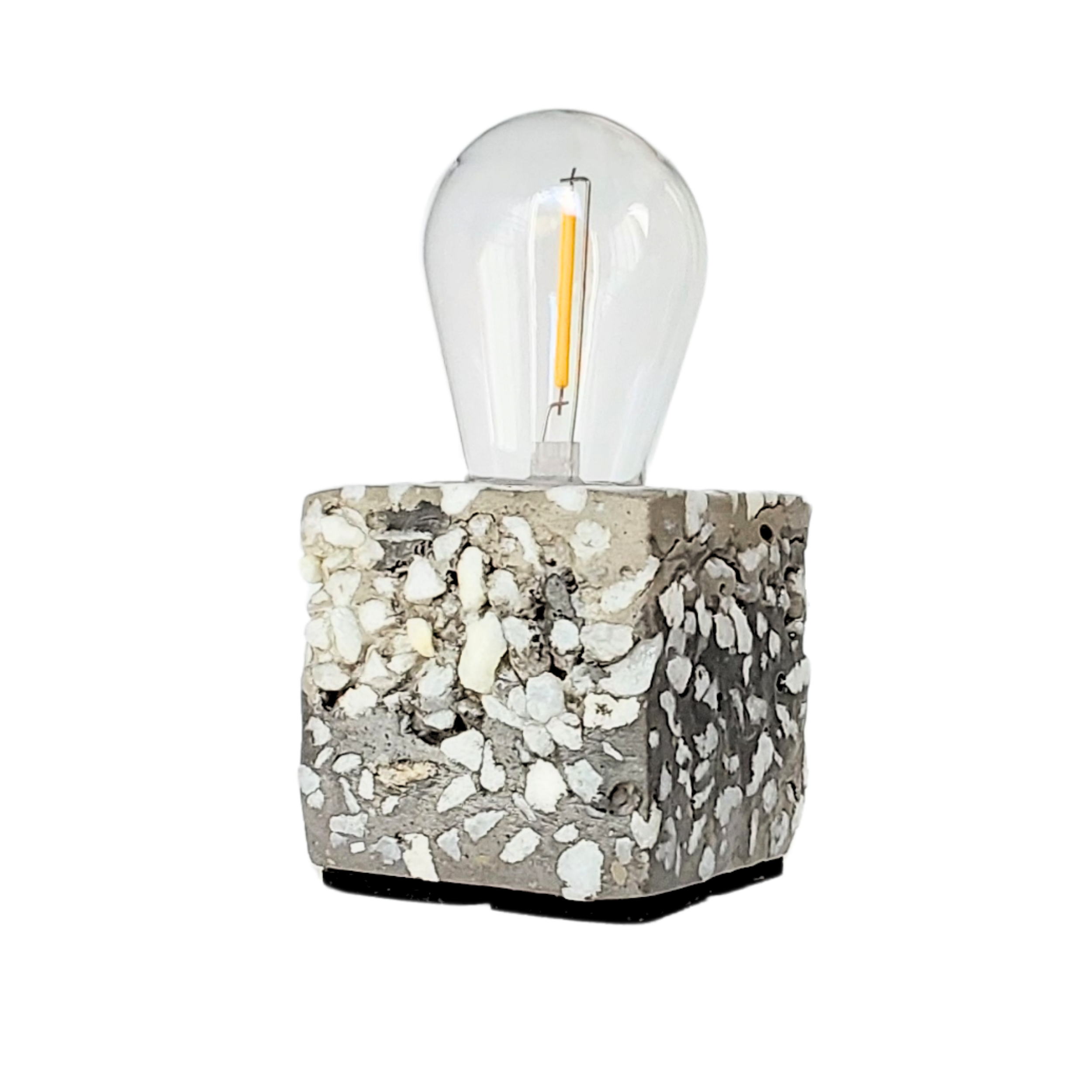 Com base em concreto cinza e pedrinhas brancas naturais, cada peça carrega texturas únicas, revelando a beleza do contraste entre o bruto e o delicado. Feita à mão, ela traduz o encontro entre o silêncio da pedra e o calor sutil da luz.